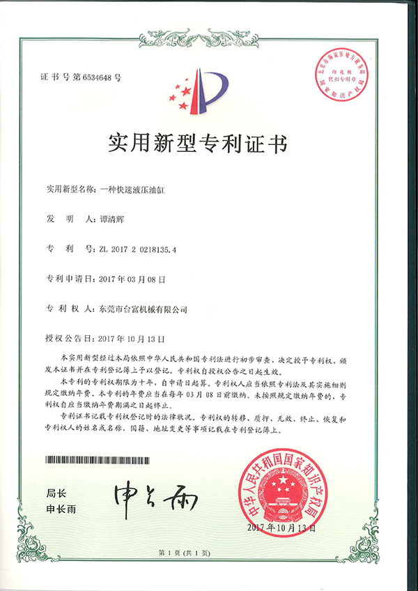 一種快速液壓油缸專利證書